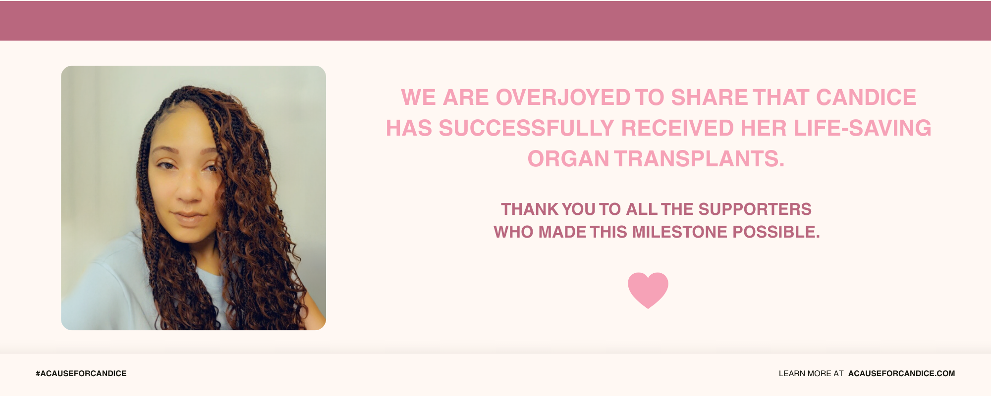 We are happy to share that Candice Davis has successfully received her life-saving organ transplants. She is out of surgery and already showing the positive results we’ve all been hoping for. THANK YOU to all supporters who made this milestone possible. We are grateful. As we celebrate Candice’s second chance, we are moved by the selfless gift that made this moment possible. Please consider honoring this journey, and learn more about becoming an organ donor today.